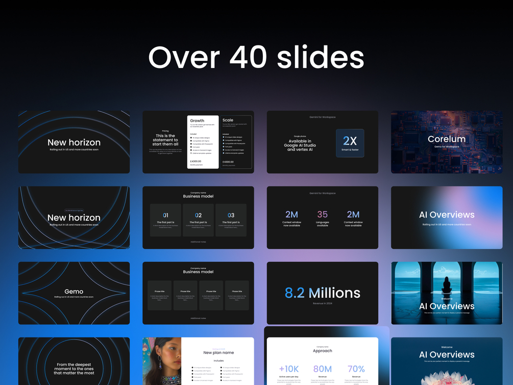 Figma file including +40 fully customisable presentation slides in a 16:9 ratio