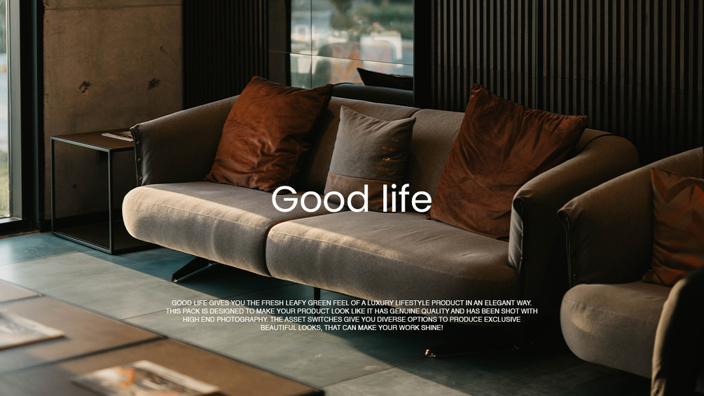 Good life gives you the fresh leafy green feel of a luxury lifestyle product in an elegant way. This pack is designed to make your product look like it has genuine quality and has been shot with high end photography. The asset switches give you diverse options to produce exclusive beautiful looks, that can make your work shine!