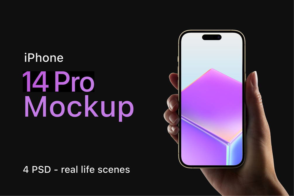 The iPhone 14 pro mockup is the latest addition to our growing list of iPhone mockups. Packed with 4 highly polished photorealistic mockups, you can showcase your app or website in style!